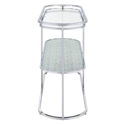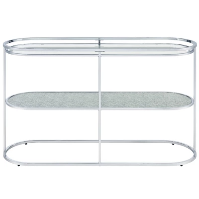 Catch the eye of friends and family alike with the stellar, modern style of this contemporary metal console table. Its oval shape and lower shelf bring eye-catching flair as the shelf create a compelling effect with rippled glass. The top is clear glass, ideal for showing off decor and greenery or flowers. A chrome finish completes the design with gleaming, modern appeal.