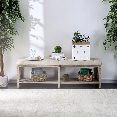 You’ll love the function and fashion of this upholstered wood bench. It’s expertly fashioned of solid wood and wood veneer with plenty of room for seating and open storage. The luxuriant linen is upholstered in a charming beige tone that upgrades the ambiance of any living room or front hallway.